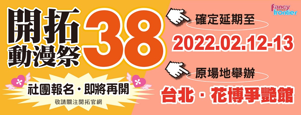 開拓動漫祭籌備委員會表示,經歷新冠疫情波折,8月的FF38活動暫停舉辦。雖然目前疫情趨緩,但可供大型同人活動舉辦的場地依舊受限,考量籌備時間及諸多不確定因素後,故決定FF38活動延至2022年2月12-13日舉辦,地點仍為花博爭豔館。