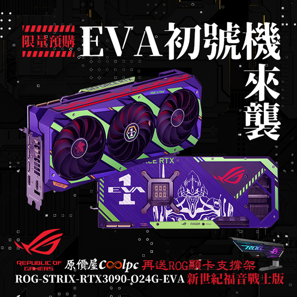 華碩旗下電競品牌「Republic of Gamers (ROG) 玩家共和國」,近期宣布推出「ROG 電競補完計畫」,首波商品為「 ROG STRIX GeForce RTX 3090 EVA 限定版顯示卡」,除有福音戰士初號機經典紫綠配色,亦會加贈ROG Herculx 顯卡支撐架,售價63,990元。