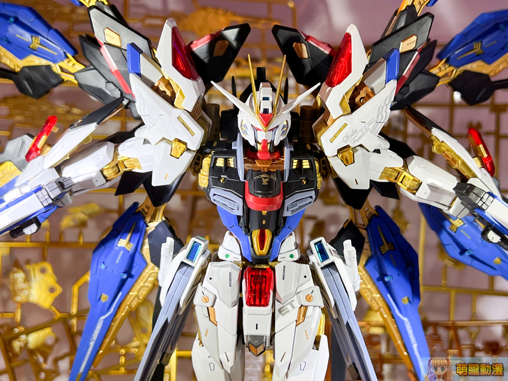 「MGEX 1/100 攻擊自由鋼彈」為凸顯原設定金色PS裝甲素材,特別強調「金屬質感」,使用了3種特殊加工的白金塗層、黃金塗層、2種金屬成型色、蝕刻金屬貼紙等工藝技術方式,來呈現具變化感的金色骨架。