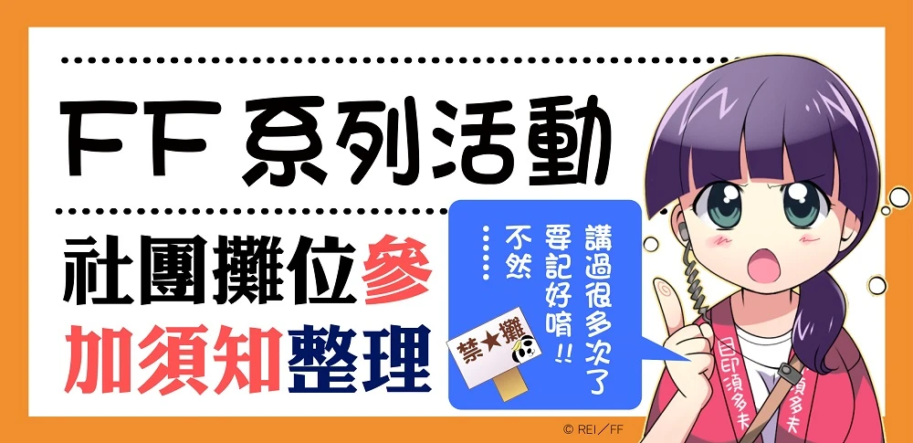 社團攤位列隊:參加FF活動之社團有義務整理自己攤位前之排隊狀況,若攤位前出現足以妨礙會場交通動線之人潮,主辦單位將視情況現場更動該社團之攤位位置。