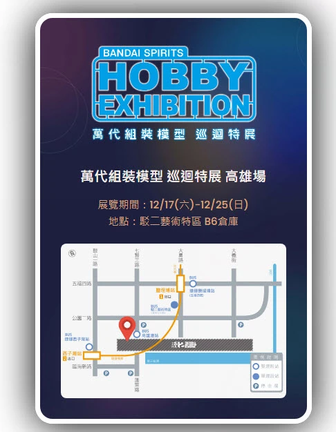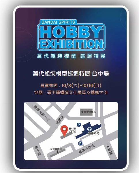 而最新「2022組裝模型特展」則確定將以北中南巡迴展方式舉辦,其中台北場從8月27日-9月4日,於華山1914文創園區 中7B舉辦;台中場為10月8日(六)-10月16日(日),於臺中驛鐵道文化園區&鐵鹿大街舉辦;高雄場為12月17日(六) -12月25日(日),於駁二藝術特區 B6倉庫舉辦。