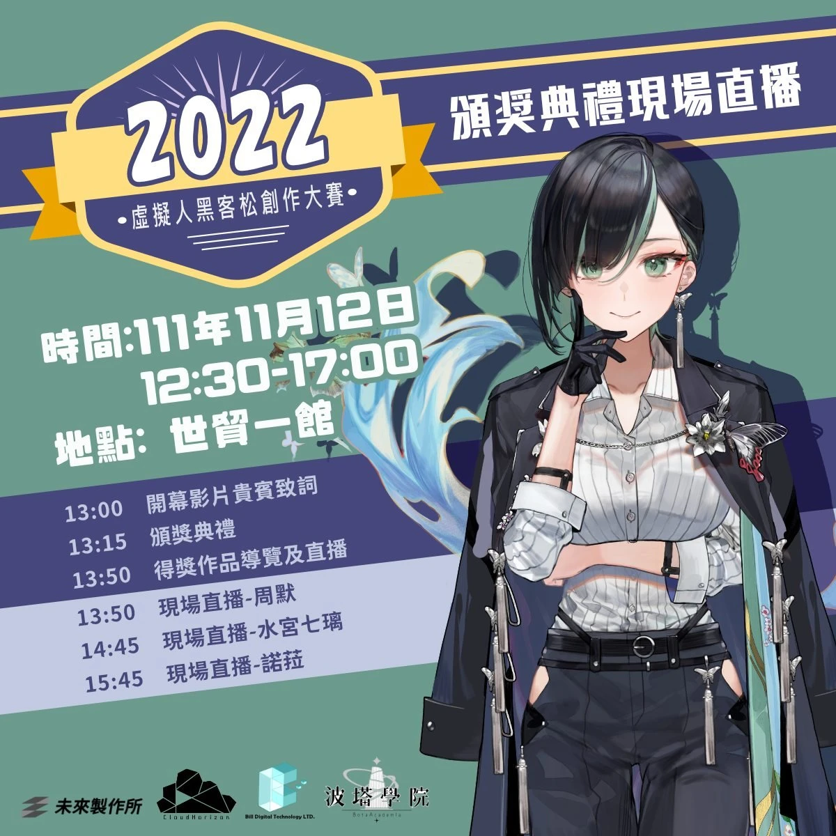 由數位發展部數位產業署、經濟部工業局指導,DIGI+數位經濟產業推動辦公室、財團法人資訊工業策進會、台灣虛擬網紅協會主辦的「2022虛擬人黑客松創作大賽」,主辦單位宣布11月12日的頒獎典禮上將邀請Vtuber周默、水宮七璃與諾菈在現場直播。