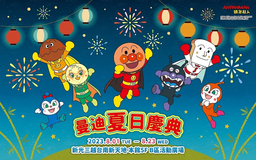 《麵包超人》主題將於「曼迪夏日慶典」台南推出童裝、鞋襪、背包等服飾配件,還有全系列麵包超人玩具;另外還有軟Q的Sirotan海豹小白,有多樣百變造型絨毛玩偶及居家雜貨。