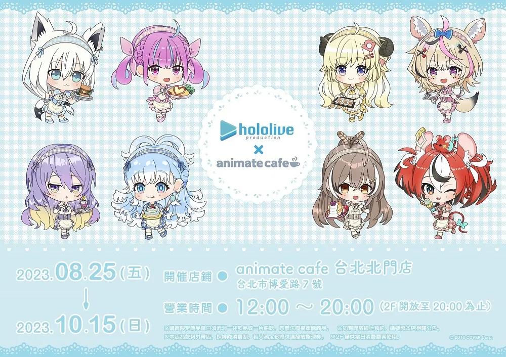 2023「hololive production × animate cafe 台北北門店」從2023年8月25日-10月15日,於animate cafe 台北北門店開設。