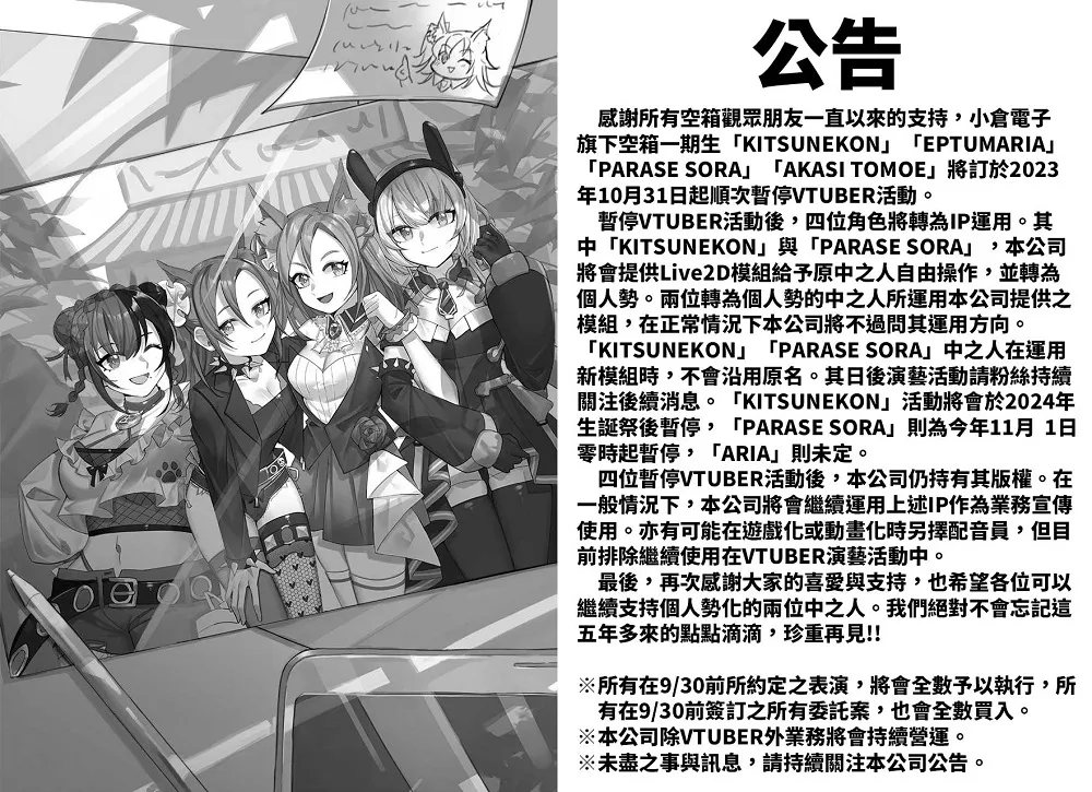 只是10月第一天,小倉電子就表示將終止VT演藝經紀事務,而目前活動中的「KITSUNEKON」、「EPTUMARIA」 、「PARASE SORA」 、「AKASI TOMOE」,也確定於2023年10月31日起順次暫停VTUBER活動,但角色版權仍由小倉電子持有,並改為IP運用。