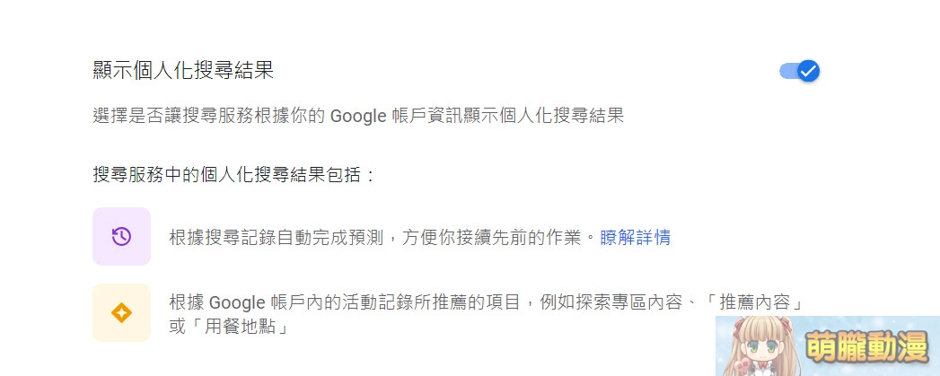另外再補充「個人化搜尋」與「安全搜尋」的差異,有人會因為色色的敏感性質而把這兩者混為一談,「個人化搜尋」是Google「資料和隱私權」設定的一環,目的是透過各種設定提供「理想」的搜尋結果。