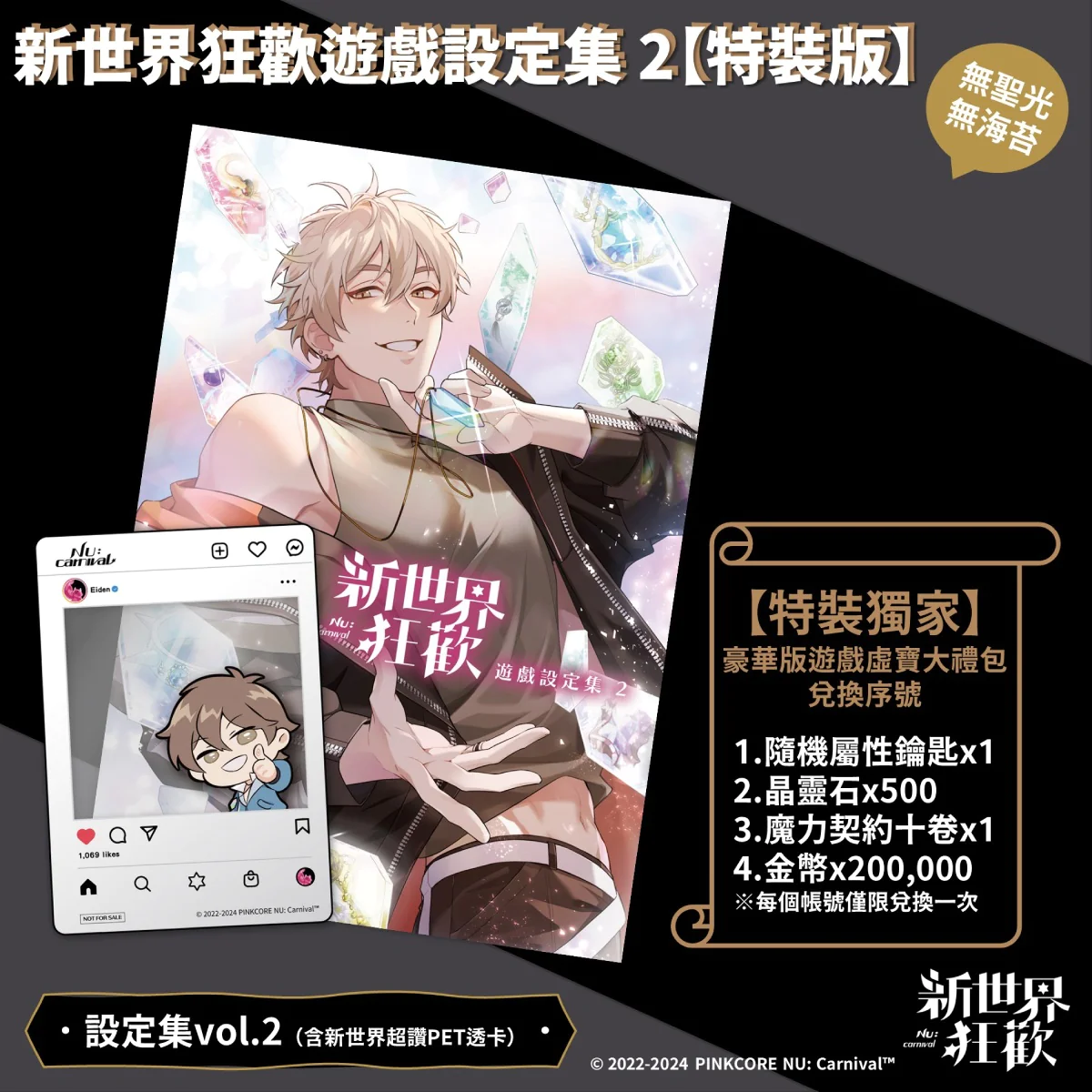 《新世界狂歡遊戲設定集 (2)》特別收錄首刷特典「新世界超讚PET透卡」及「遊戲虛寶兌換序號」(晶靈石x300、魔力契約x3、金幣x100,000);(特裝版)則以新繪封面圖特別設計絕美又夢幻的「珍藏書盒」以及特典「雙層壓克力立牌」、收錄特典「活動角色書籤套組」包括伊得、八雲、艾德蒙特、奧利文、崑西、玖夜、可爾、布儡、啖天一共九款、「遊戲設定集vol.2(含首刷特典透卡)」以及「豪華版遊戲虛寶大禮包兌換序號」一般鑰匙隨機禮盒x1、晶靈石x500、魔力契約十卷x1、金幣x200,000。特裝版與首刷特典為限量發售,售完為止。