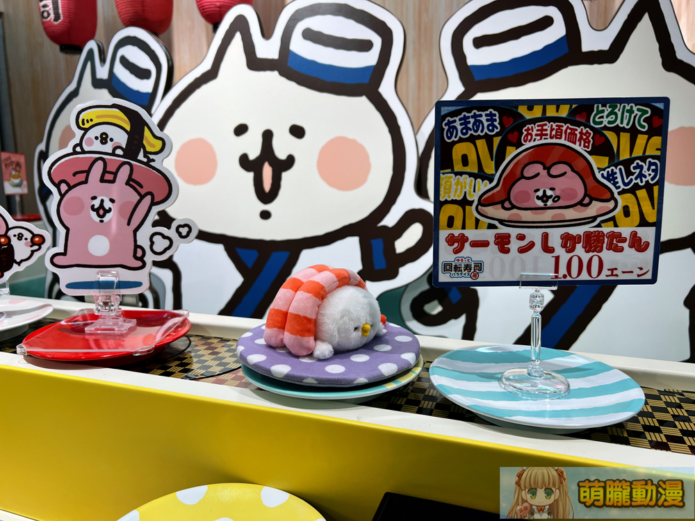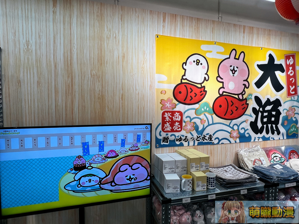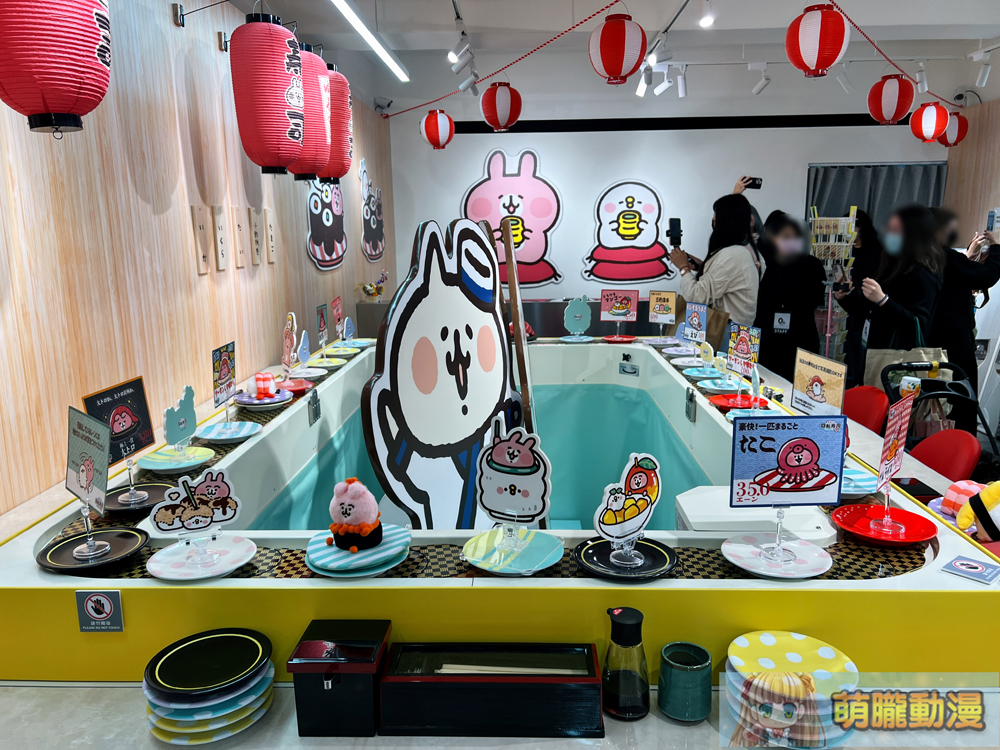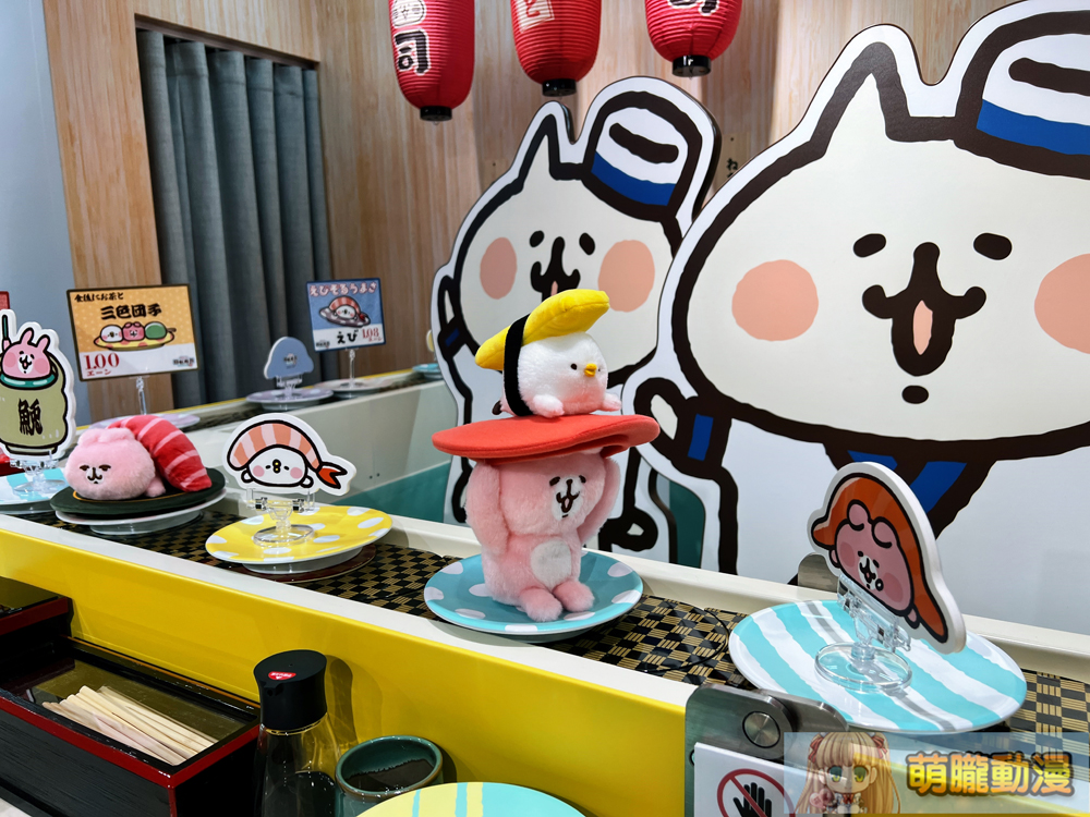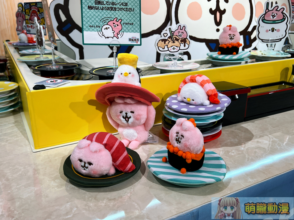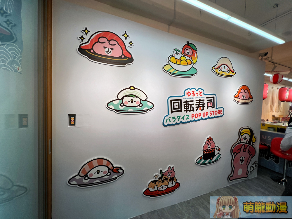 卡娜赫拉的小動物「慢悠悠 迴轉壽司樂園」快閃店,最顯著的打卡點為1:1 卡娜赫拉迴轉壽司台,可看到化身成迴轉壽司的 P 助與粉紅兔兔。