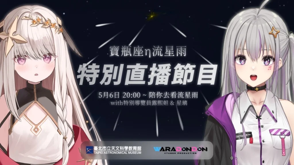 「2024.05.06台北天文館 寶瓶座η流星雨直播」預定晚間8點於YouTube頻道直播,Vtuber露熙妲、星璃,則是會在直播開始後的前2小時在直播頻道,與觀眾一同欣賞流星雨。