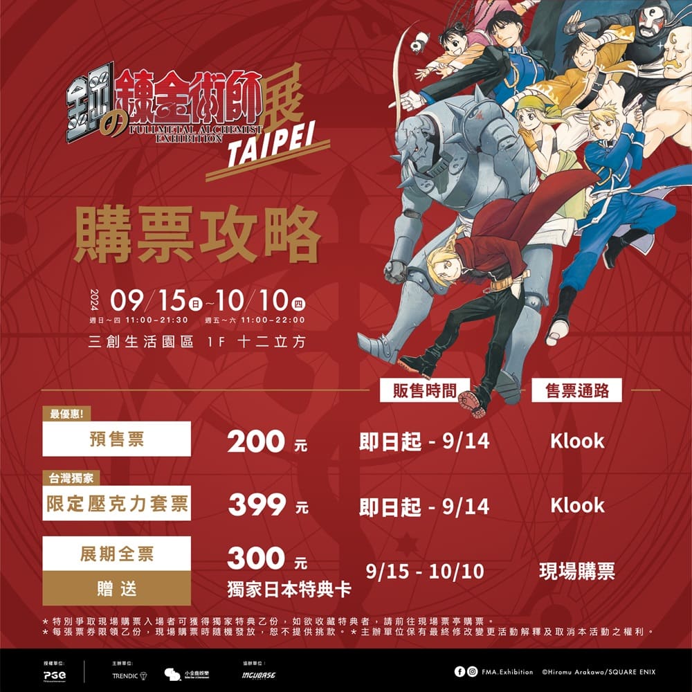 由卓狄國際、小金鹿娛樂主辦,INCUBASE協辦的「鋼之鍊金術師展 台北站」,將自9月15日起於三創舉辦,並預計7月29日起開始販售預售票。