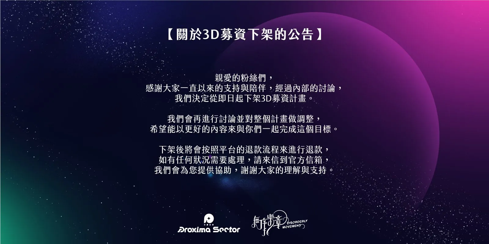 根據Vtuber佐藍、白月心宿、梨亞卓恩說明直播提到,因製作人預計畫統籌的佐藤S病倒,以至於很多計畫難以順利依規劃進行;比鄰星域則僅提到經過內部討論決議9月19日起正式下架募資計畫,並將調整計畫以更好的內容再次推出。