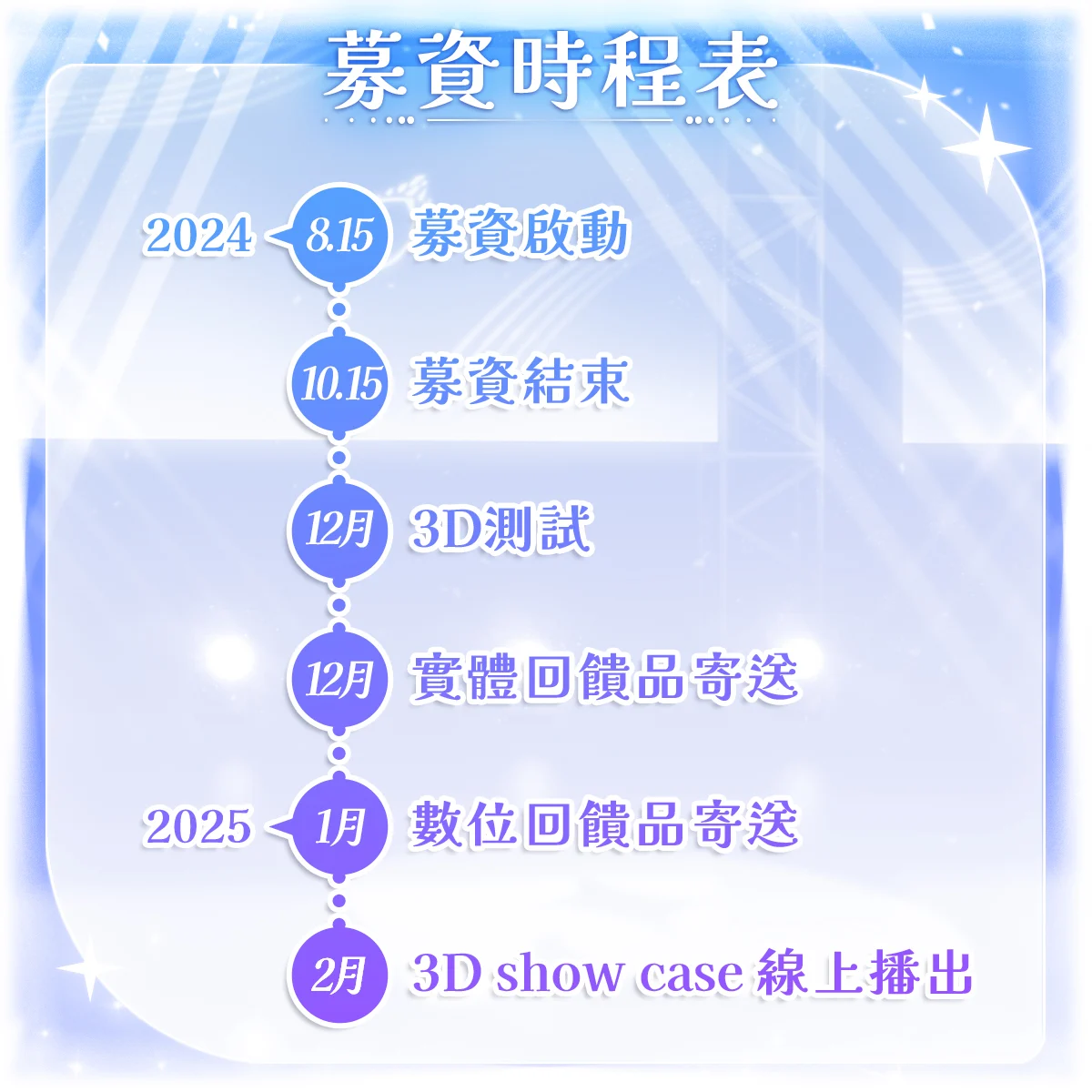 Vtuber佐藍、白月心宿、梨亞卓恩 3D化募資計劃,自2024年8月15日啟動,原定行程為募資至2024年10月15日,2024年12月測試3D,2025年2月於線上播出3D show case,基本達標募資金額為新台幣150萬元,並一路規劃到400萬的解鎖獎勵。