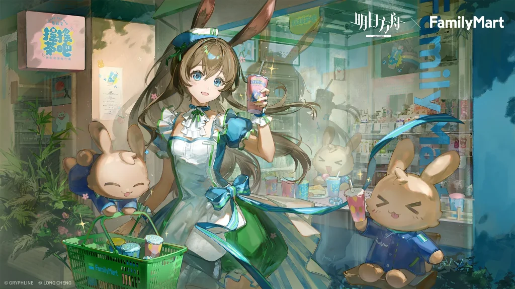 《明日方舟》與「全家便利商店」聯名期間共同推出「搖搖茶吧」聯名設計杯身,到全台全家便利商店購買搖搖茶吧不論品項任2杯,即可獲得《明日方舟》虛寶,包括全家便利商店主題限定傢俱。