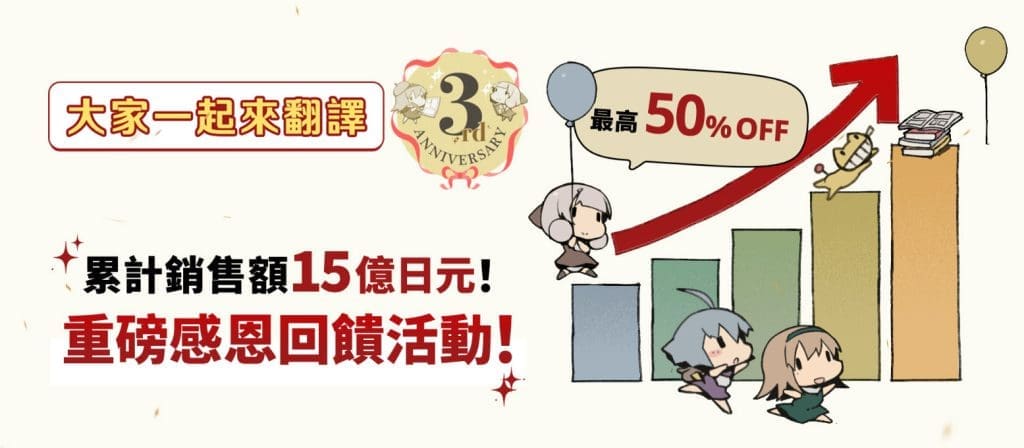 慶祝邁入3週年,DLsite中文化參與性服務「大家一起來翻譯」於限定期間推出5折優惠券,並持續舉辦「未翻譯作品助力」、「先到先得獎勵」等活動。