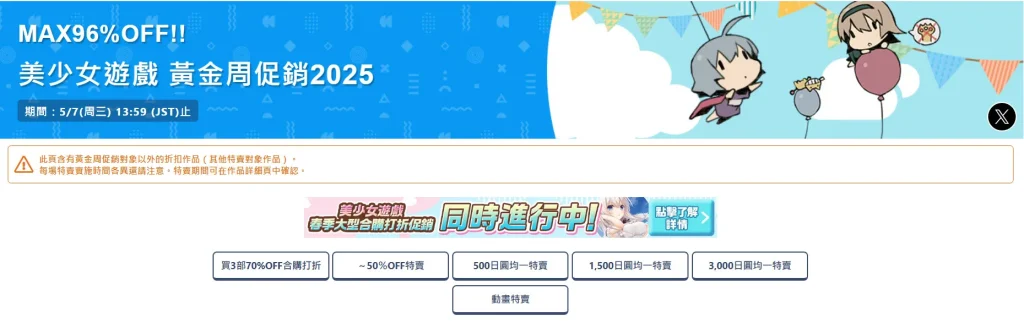 在「美少女遊戲 黃金周促銷2025」的特設頁面中,可看到「買3部3折」等各種優惠選項,老樣子針對優惠額,可以活用「折扣率」、「均一特賣」與「價格帶」來快速挑出自己能接受的區間,搭配性癖能找到更多所愛。
