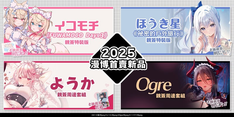買動漫公開2025漫畫博覽會販售資訊,除有繪師しま原、雪新品周邊外,還將販售繪師イコモチ、ようか、ほうき星、Ogre親簽周邊組,與多位繪師親簽掛軸。