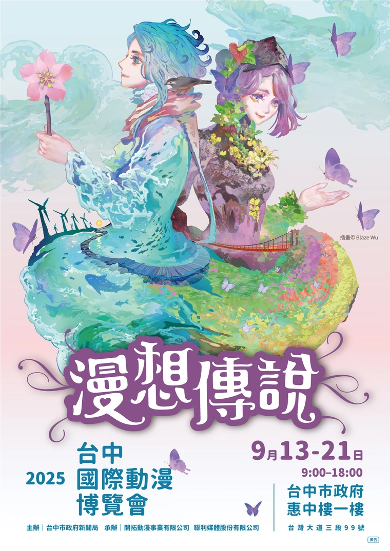 中部年度漫畫盛會「2025台中國際動漫博覽會」將於9月13日至21日盛大登場,今年首度移師市政大樓舉辦,以「漫想傳說」為主題,邀請到插畫家Blaze Wu創作,融合台中山海景緻與奇幻傳說意象的主視覺「山神與海神」。