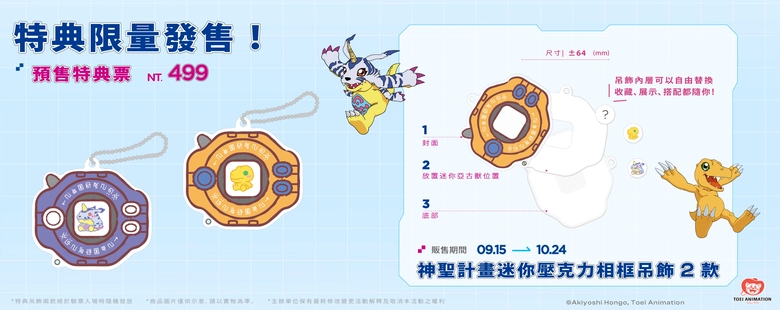 五、預售限定兩款神聖計畫特典套票組,本次特別推出海外場限定「神聖計畫迷你壓克力相框吊飾」兩款套票組,設計細節完整復刻初代經典,內層還能替換成你最想留下的照片,可將回憶裝進神聖計畫裡,數量有限、售完為止。