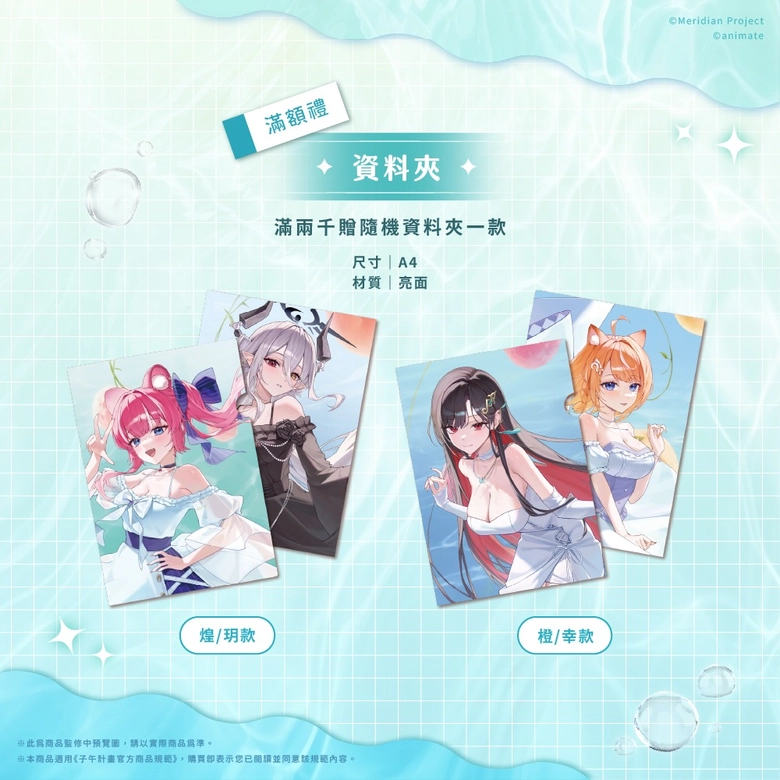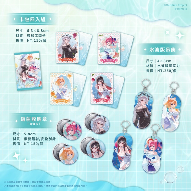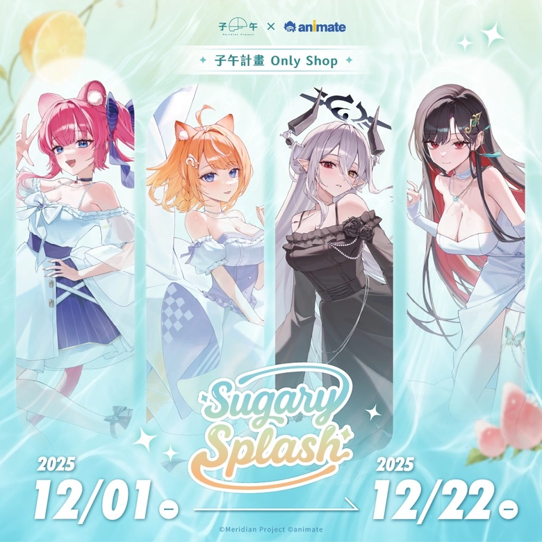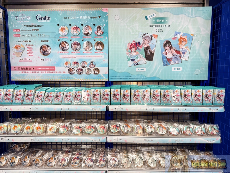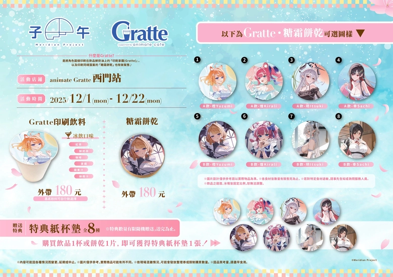 其中「子午計畫」主題,也已公開將與子午計畫四位Vtuber:橙、煌、玥、幸 合作,除將販售全新造型的多款周邊,Gratte 印刷飲料與糖霜餅乾也將同步登場。