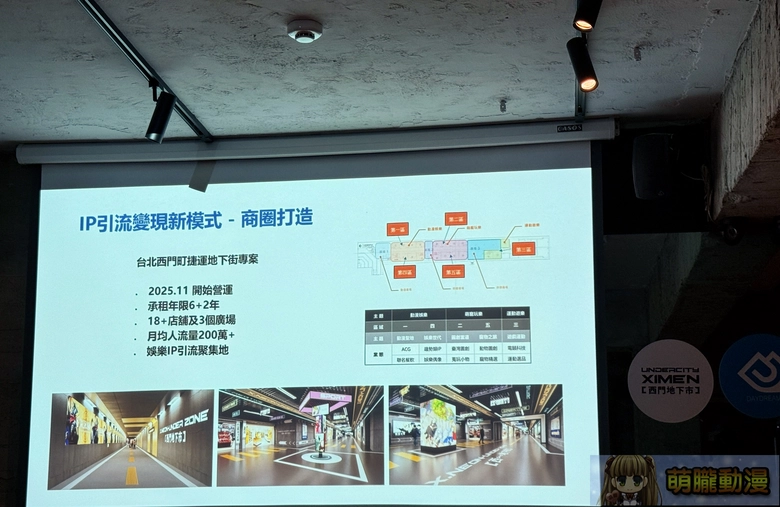 現場還在持續施工中,但大體可看到整體樣貌(照片為2025年12月4日實景)簡報中則提到「西門地下市」將在18 個店鋪單位與 3 個廣場的地下空間配置中,目前規劃分為「動漫娛樂」、「萌寵玩樂」與「運動娛樂」3大主題,再細分為「動漫聖地」、「娛樂世代」、 「圖創當道」、「寵物之旅」、「遊戲運動」5個子題區域。