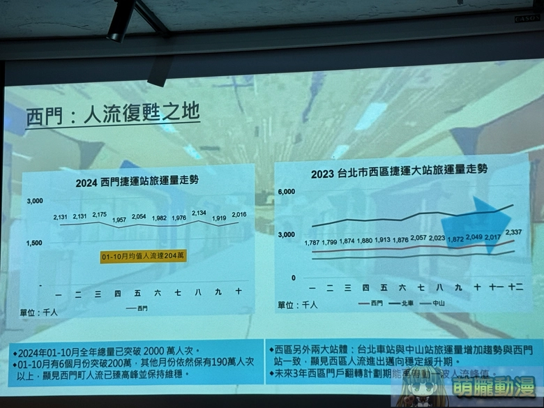 在分享簡報中也提到西門捷運站運量人潮的調查數據,調查年限為2023年與2024年,可看到2024年1-10月全年營運總量突破2000萬人次,而每個月的表現都有在190萬以上,為一穩定與高流量的人潮發展場域。