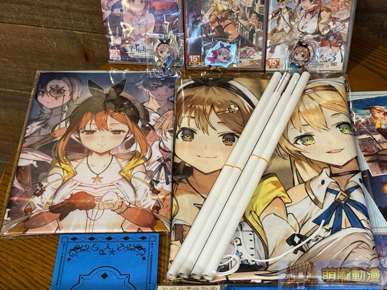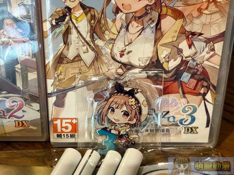 第一件是「新繪插畫壓克力吊飾3入組」。雖然是Q版圖案,但將它們並排在一起,就分別對應了萊莎在三部曲的不同形象與成長軌跡:一路從無所畏懼帶著稚氣的鄰家少女,慢慢轉變成還是有點冒失,但已是獨當一面的「鍊金術士」與「冒險者」,將女孩身心轉變的印象濃縮成了3組吊飾。