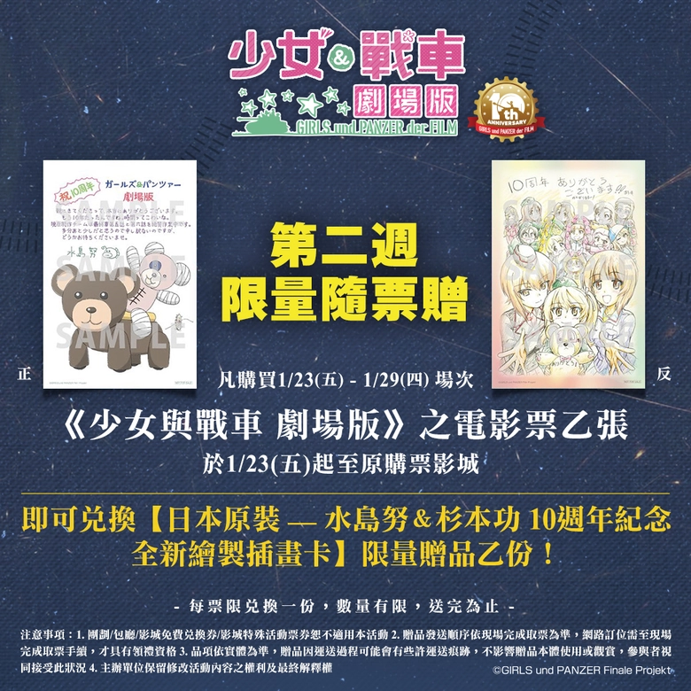 另外也公開《少女與戰車 劇場版》10週年紀念上映第二週限量隨票贈特典資訊,凡購買1/23(五)~1/29(四)場次《少女與戰車 劇場版》10週年紀念上映之電影票乙張,於1/23(五)起至原購票影城即可兌換【日本原裝—水島努&杉本功10週年紀念全新繪製插畫卡】限量贈品乙份。