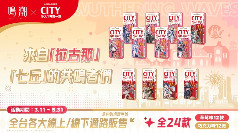 《鳴潮》⤫ City NO.1城市一族預計從3月11日-5月31日,推出24款合作包裝(草莓味12款/巧克力味12款),並將於全台各大線上、線下通路販售,此外還有獲得限量虛寶序號、《鳴潮》實體周邊抽獎等活動。