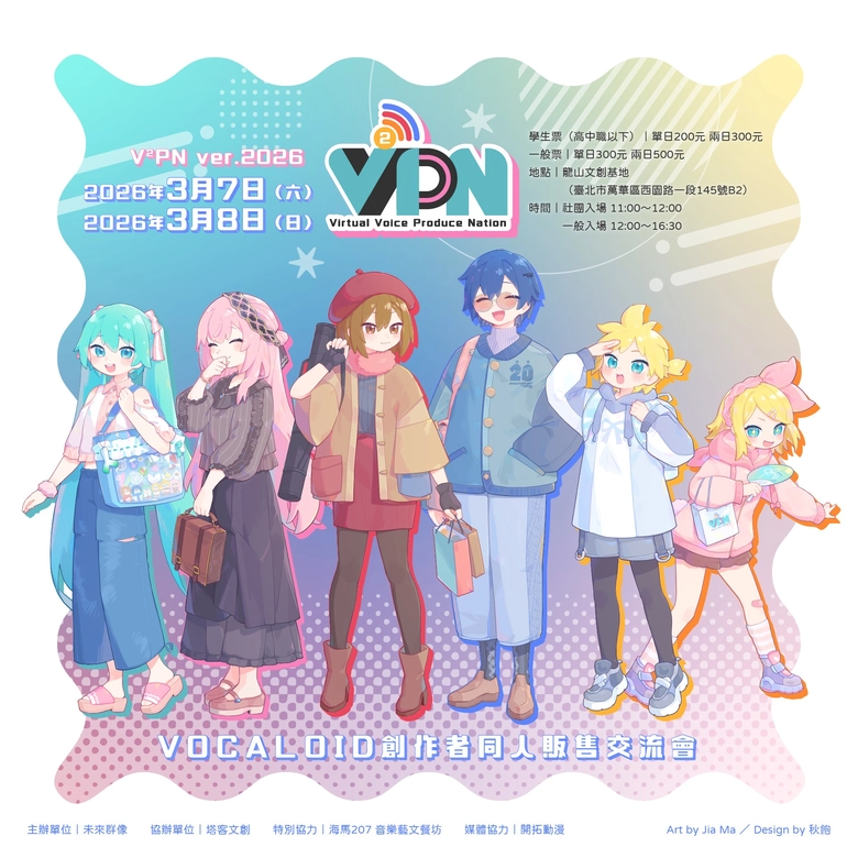 由未來群像主辦,塔客文創協辦的「V²PN Ver. 2026」VOCALOID創作者同人販售交流會,將於3月7日-8日在龍山文創基地舉辦,此次擴大規模除了同人攤位外,還規畫了同好祭壇、piapro之牆、抽獎大會、日本創作者訪談等。