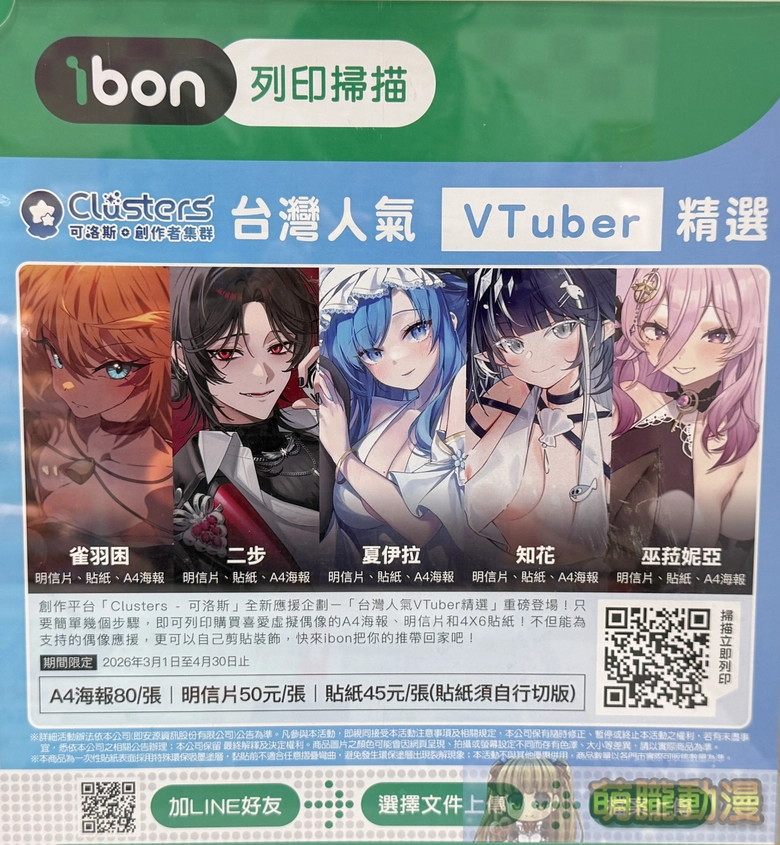 Clusters 可洛斯 × ibon 雲端列印網「台灣 VTuber 精選」第四波計畫公開,活動期間可至全台設有 ibon 機台的便利商店,輸入取件編號或掃描 QR Code,印製雀羽困、二步、夏伊拉、知花及巫菈妮亞多位Vtuber,海報、明信片、貼紙等周邊。