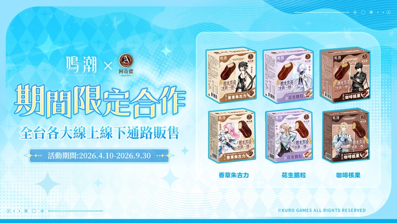 《鳴潮》× 阿奇儂聯動包裝款,包含「香草朱古力」、「咖啡核果」以及「花生脆粒」三種經典人氣口味,將於全台各大線上、線下通路販售。