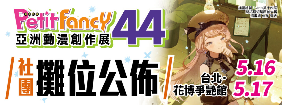 亞洲動漫創作展 Petit Fancy 44(PF44),將於5月16-17日在花博爭艷館舉辦,以下整理相關活動資訊。