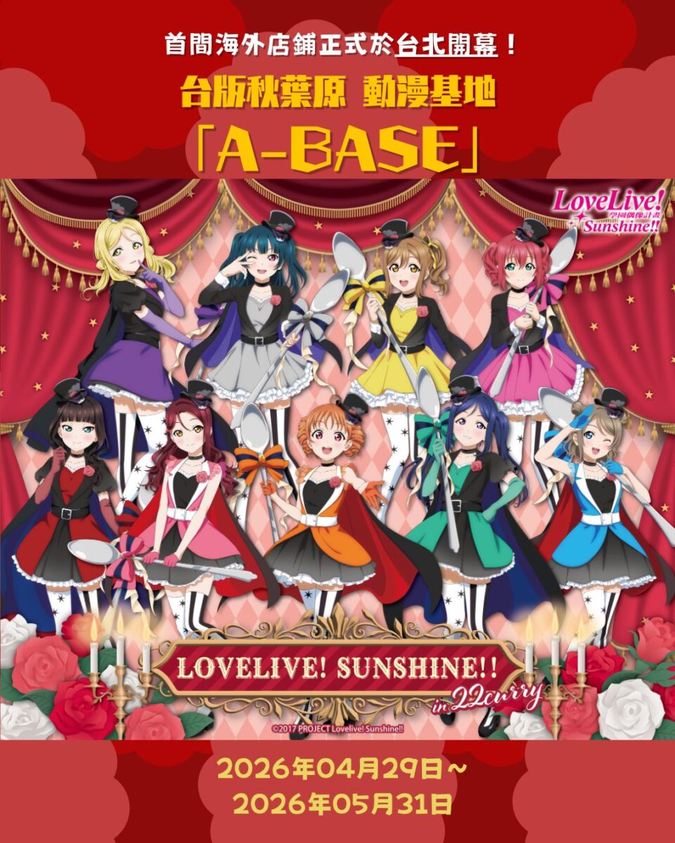 「Love Live! Sunshine!! in 22咖哩」,從2026年4月29日-5月31日,在「A-BASE」 台北市萬華區成都路29號2F開設。
