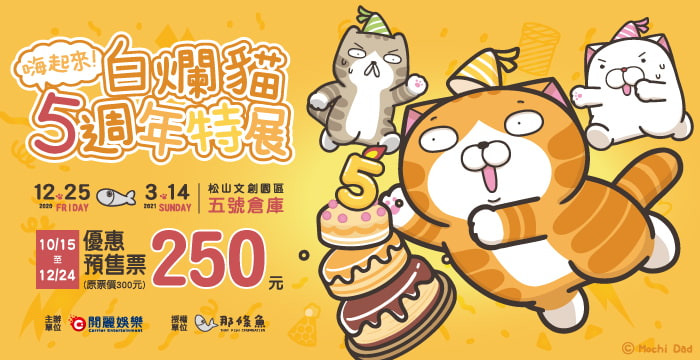由開麗娛樂主辦,「嗨起來!白爛貓5週年特展」將於12月25日起在松山文創園區開展,預售票將自10月15日起開始販售。