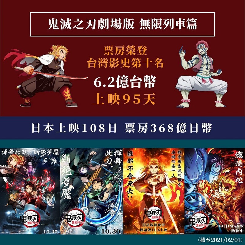 已成為現象級作品的《鬼滅之刃》,故事描述賣炭維生的善良少年炭治郎,某天家人慘遭鬼殺害。而唯一倖存的妹妹禰豆子,卻變化成鬼。遭到絕望現實打擊的炭治郎,為了讓妹妹恢復回人類,為了被殺害的家人向鬼報仇,決定踏上”獵鬼”之路。已推出的劇場版《鬼滅之刃劇場版 無限列車篇》,也在台灣創下票房突破6億的紀錄。