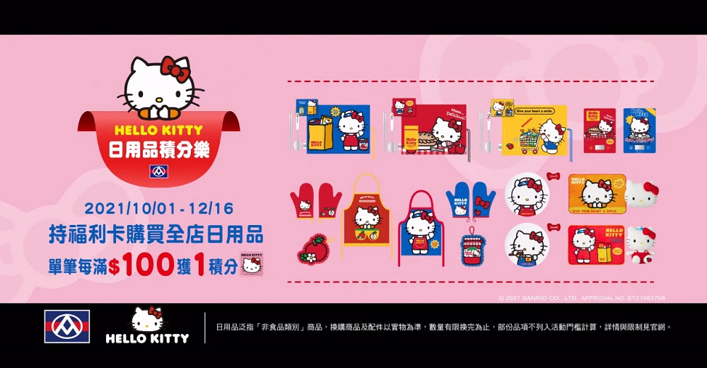 今(1)日起,全聯推出「Hello Kitty日用品積分樂」活動,活動期間持福利卡購買日用品單筆消費每滿100元,即可獲得1點積分樂,集滿2或6積分即可加價換購。