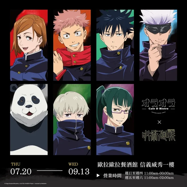 信義區全新概念餐酒館「歐拉歐拉オラオラ」宣布下期主題《咒術迴戰》,將自7月20日起開設,除有五條悟六眼特調等主題餐飲外,亦將推出全新周邊。