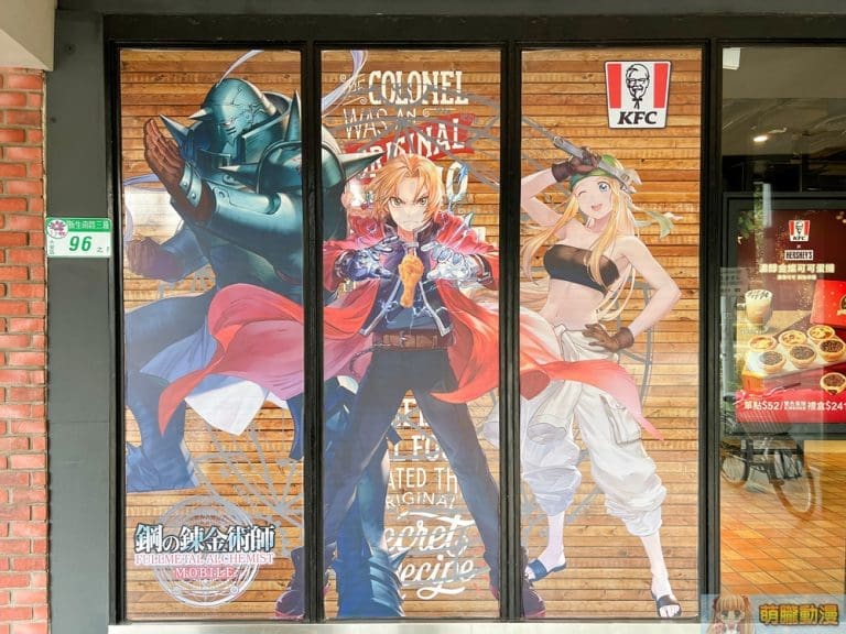 肯德基與手遊《鋼之鍊金術師 M》推出跨界合作,於肯德基台北台大店開設「《鋼之鍊金術師 M》 X 肯德基主題店」,透過窗貼、圖騰等呈現《鋼之鍊金術師》的氛圍。