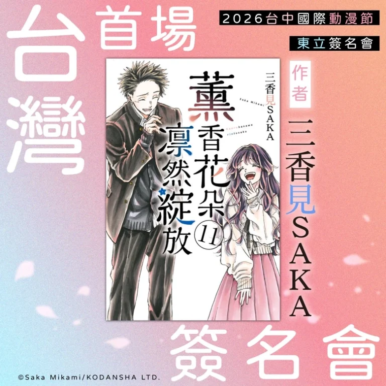 東立出版社公開2026台中國際動漫節最新活動情報,將舉辦《薰香花朵凛然綻放》作者三香見SAKA 台灣首場簽名會,更多詳細資訊將於3月初公布於東立粉專與東立台中動漫節官網。