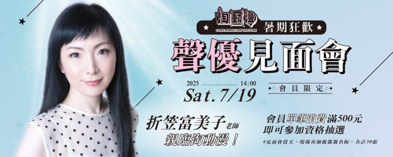 「桃園動漫文創交流基地-淘動漫」公開2025夏日活動資訊,將於7月19日在桃園舉辦聲優「折笠富美子」專屬粉絲見面會,並公開活動參與辦法,以下圍相關資訊。