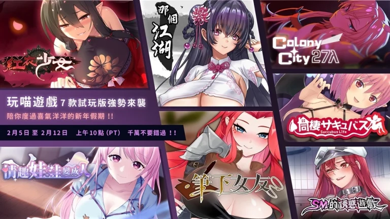 台灣成人遊戲發行商「玩喵遊戲(Playmeow)」,配合Steam 新品節公開《那個江湖》、《遠星都市27λ》、《筆下女友》、《SM的誘惑遊戲》、《情趣娃娃變成人》、《與魅魔締結契約的同居生活》及《紅衣少女- 山中鬼魅的傳說》等7款遊戲試玩版,以下為相關介紹。